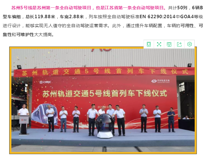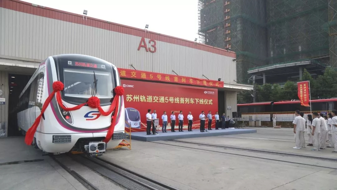 9月18日,苏州轨道交通5号线首列车在浦镇公司下线,标志着苏州城市轨道交通开启了全自动驾驶新时代。这是中车南京浦镇车辆有限公司继A型全自动驾驶地铁列车后,又增添B型车全自动驾驶平台。苏州市轨道交通集团有限公司党委书记、董事长周明保,党委副书记、总经理姚振康,浦镇公司党委书记、董事长赵大斌,党委副书记、总经理李定南等出席了仪式。