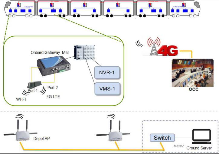 功能概述:车地数据无线通讯系统由车载无线系统及地面WiFi系统两部分构成,车载系统可通过4G或WIFI实现车地无线传输。